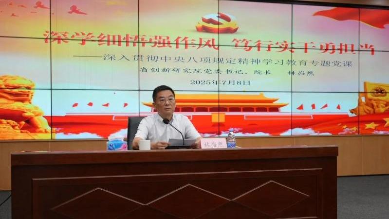 7月8日,省创新研究院举办深入贯彻中央八项规定精神学习教育专题党课,院党委书记、院长林岿然同志以“深学细悟强作风 笃行实干勇担当”为主题,为全院党员、干部讲授专题党课,在家院领导,院...