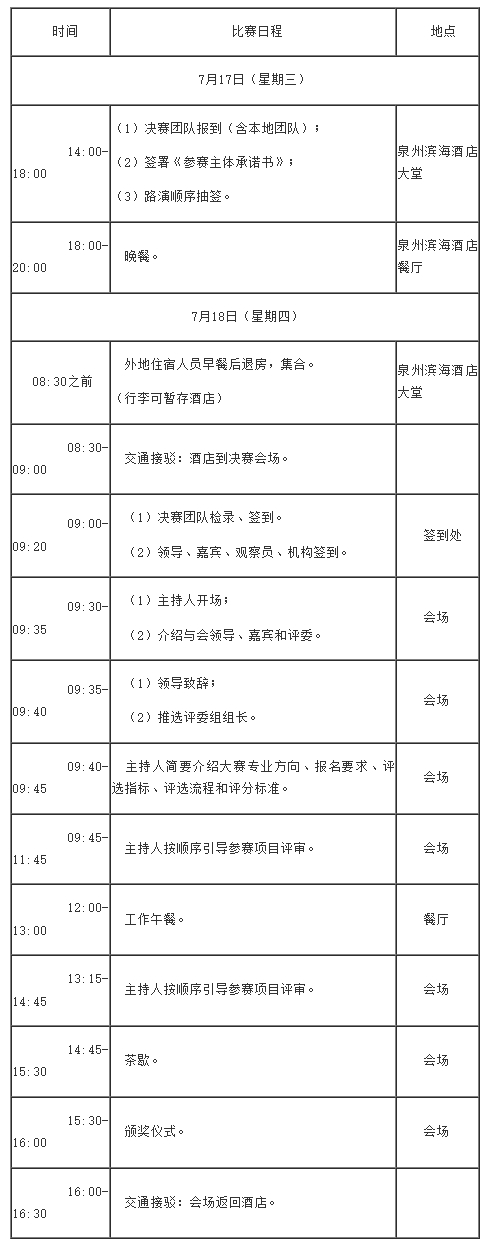(五)食宿交通。大赛组委会统一安排外地参赛团队入住泉州滨海大酒店,具体安排及要求如下: