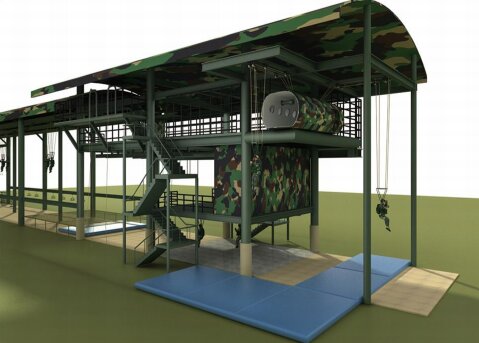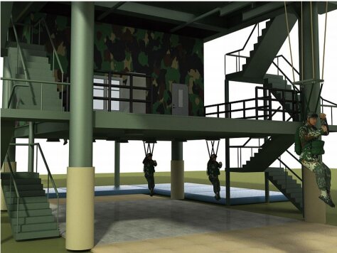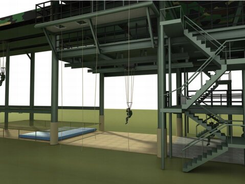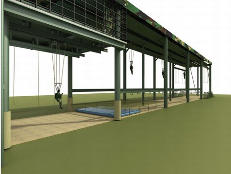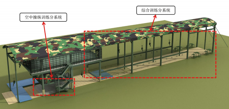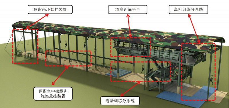 多功能伞降模拟训练系统承载平台为三层钢结构构造,尺寸为82*8*16米(长宽高),占地面积656平方米;一层为空中操纵训练和着陆训练区域;二层为着陆训练区和总控室;三层为综合全流程伞降训练和侧门、尾门离机动作训练以及翼伞姿势动作训练,可作为室内应急警伞场。左侧向外延伸拓展滑降平台,能够满足约2个连同时训练:在55米滑行轨道支撑架左右两侧预留传统伞降基础训练悬挂装置,可增设空中操纵架和吊环、跳台,满足40人(4个班左右)同时训练。
