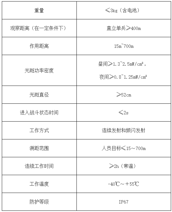激光眩目枪采用人眼敏感波段激光,使人眩晕、暂时失明,失去抵抗能力,但不会造成永久性损伤的非致命性激光武器;可与激光测距机联动,自动调整光斑大小,配备昼夜观瞄,实现全天候作业。