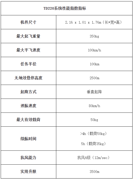 TD220共轴无人直升机是一款起飞重量为350公斤级的通用型无人直升机,自动化程度高、安全可靠且具有较强任务拓展能力。采用电控-分控旋翼控制技术和智能化、模块化设计,结合先进的H∞控制算法,实现高精度、自适应控制,抗扰动能力强,是目前国内领先的一款载重大,航时长、升限高、尺寸小、环境适应能力强的小型无人直升机,具有较强的行业化定制能力。