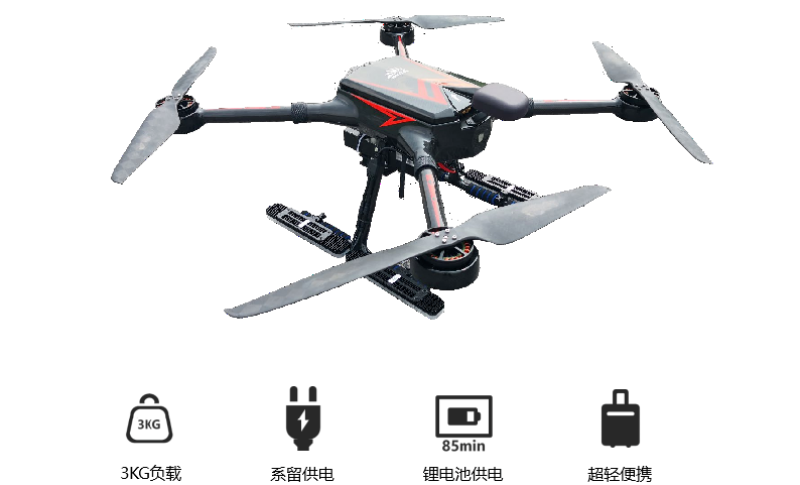支持系留供电、独立锂电池供电双重模式,系留供电模式下,提供持续的无人机动力电,支持24小时滞空悬停;独立锂电池供电模式下,提供最大85min的空载续航能力。