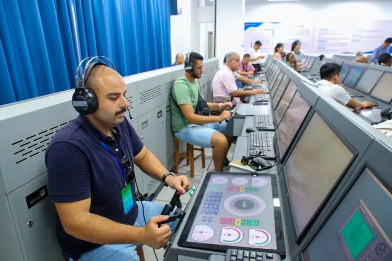 能模拟大风浪、狭水道航行、桥区避碰、船舶进出港等航行过程的多种工况;精准复现太平洋、印度洋地区的典型港口环境……在实操课上,研修班学员们通过大型航海操纵模拟器可实时模拟船舶靠泊码头场景,沉浸式体验船舶模拟操作。