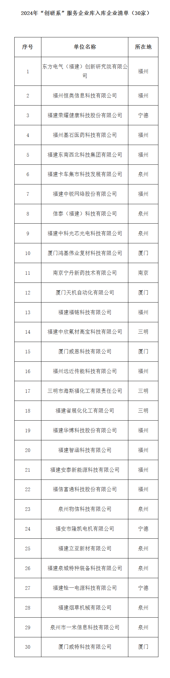 为深入贯彻落实党的二十大、二十届三中全会和习近平总书记来闽考察重要讲话精神,贯彻落实省委十一届七次全会精神和省委科技委员会的工作部署,规范福建省创新研究院企业服务流程,更好的统筹、协调、服务、保障科技成果转化,创研院完成了2024年“创研系”生态企业征集工作,现将入库企业名单予以公示。