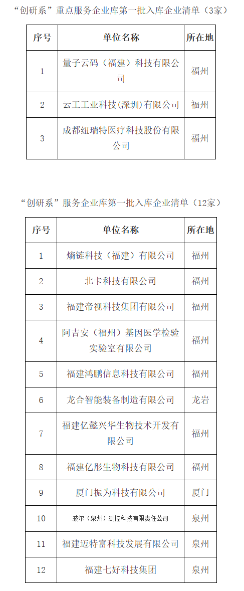 为贯彻落实党的二十大精神和2023年省政府工作报告决策部署,高标准建设福建省创新研究院(以下简称“省创研院”),规范企业服务流程,更好的统筹、协调、服务、保障科技成果转化,省创研院完成了第一批“创研系”生态企业征集工作,现将入库企业名单予以公示。