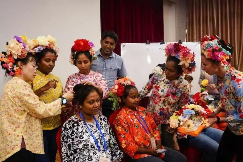 南南基地累计开展19期“一带一路”国家花卉产业管理研修班,为来自84个国家的543名学员展开培训。图为学员们正在进行插花课。南南基地供图