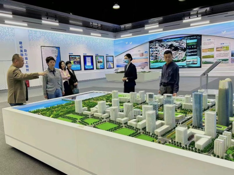 潘绣文一行首先来到福州新区滨海新城规划展示馆,通过听讲解、观沙盘、看视频等方式,了解滨海新城开发建设的战略背景和规划布局,全面感受滨海新城坚持“3820”战略工程思想精髓,高起点谋划、高标准建设所取得的发展成果。