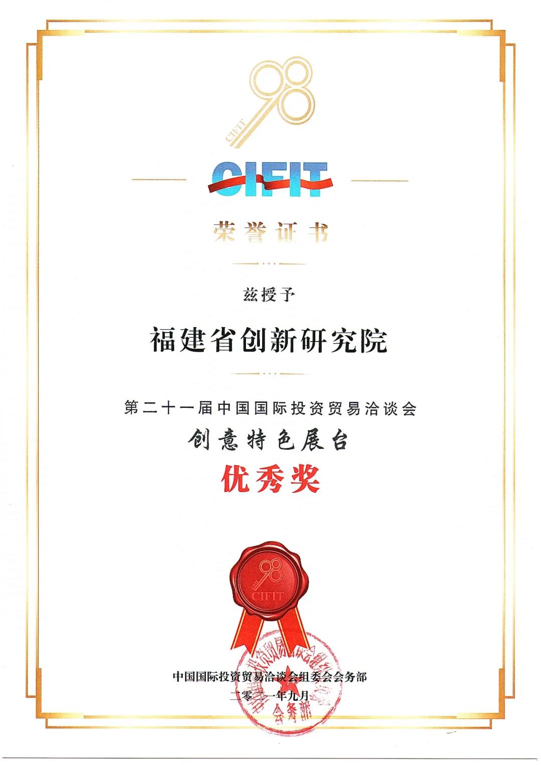 第二十一届中国国际投资贸易洽谈会落下帷幕,福建省创新研究院在本届投洽会上设置专馆,采用云上+线下形式,全方位多角度展示我院功能定位、发展路径以及设立以来取得的各项成果。这是我院首次在全国性展会上亮相,并荣获本次投洽会“创意特色展台优秀奖”。中国国际投资贸易洽谈会组委会发来感谢函,充分肯定了我院的工作。