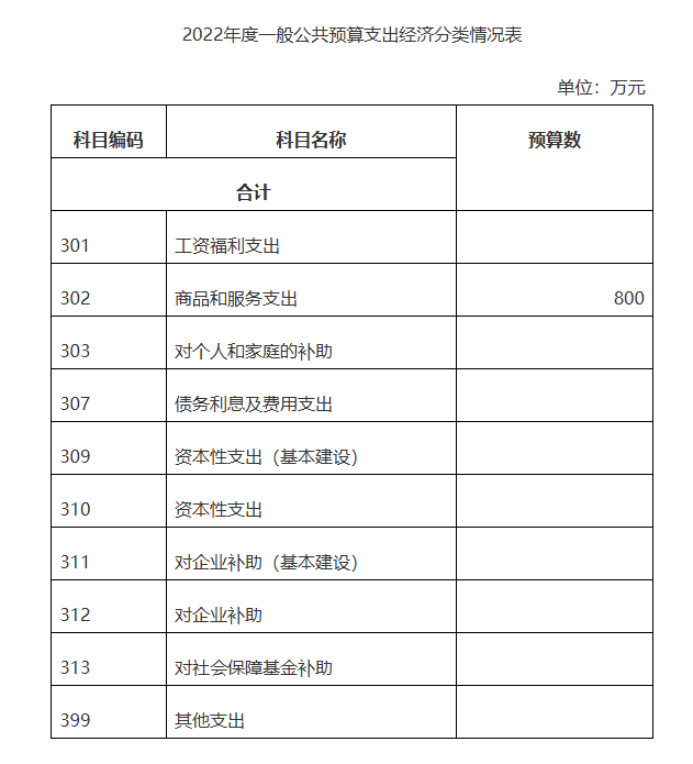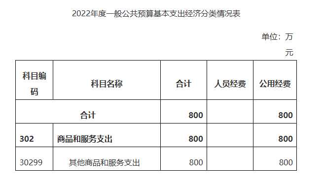 2022年度一般公共预算拨款基本支出800万元,其中:公用经费800万元,主要包括:办公费、印刷费、咨询费、手续费、水费、电费、邮电费、取暖费、物业管理费、差旅费、因公出国(境)费用、维修(护)费、租赁费、会议费、培训费、公务接待费、专用材料费、劳务费、委托业务费、工会经费、福利费、公务用车运行维护费、其他交通费用、税金及附加费用、其他商品和服务支出、办公设备购置、专用设备购置、信息网络及软件购置更新、公务用车购置、其他资本性支出。