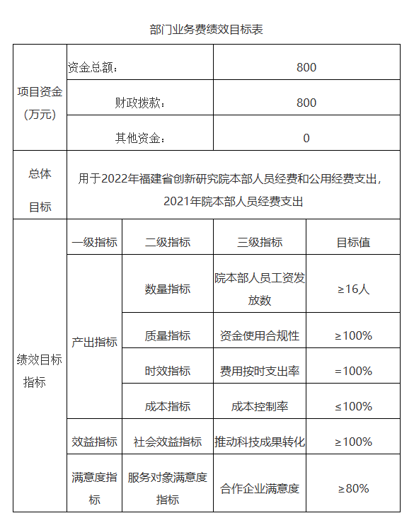 2022年,福建省创新研究院部门共设置6个项目绩效目标,共涉及财政拨款资金800万元。