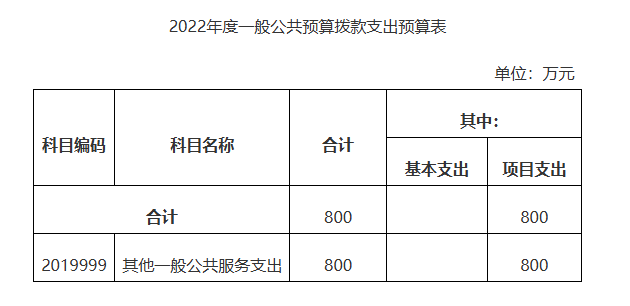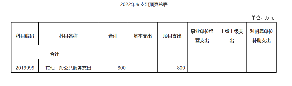 2022年度一般公共预算拨款支出800万元,比上年增加500万元,增长167%,主要原因是单位为2021年新成立单位,主要支出项目(按项级科目分类统计)包括:2019999其他一般公共服务支出800万元。主要用于项目支出。