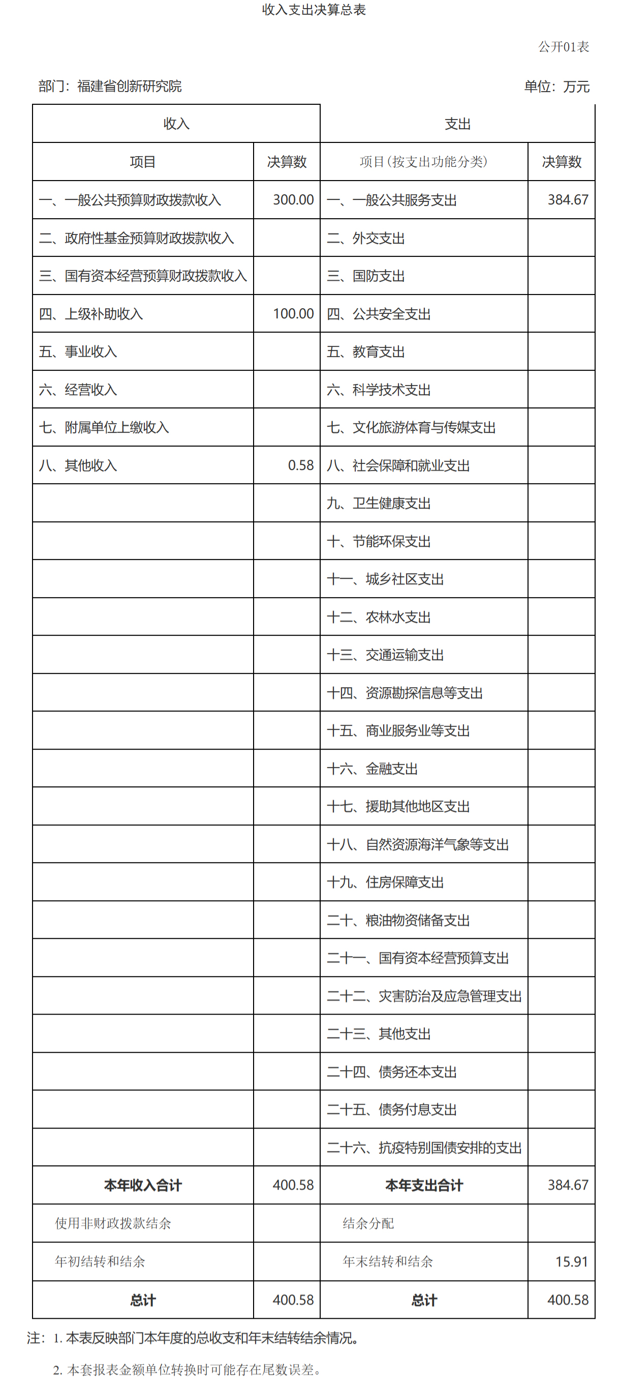2021年本部门年初结转和结余0.00万元,使用非财政拨款结余0.00万元,本年收入400.58万元,本年支出384.67万元,结余分配0.00万元,年末结转和结余15.91万元。