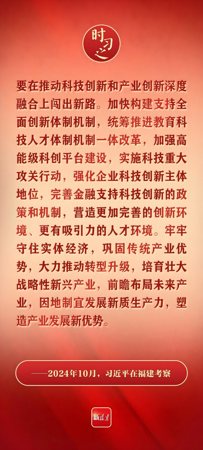 2024年10月,习近平总书记在福建考察时指出,要在推动科技创新和产业创新深度融合上闯出新路。加快构建支持全面创新体制机制,统筹推进教育科技人才体制机制一体改革,加强高能级科创平台建设,实施科技重大攻关行动,强化企业科技创新主体地位,完善金融支持科技创新的政策和机制,营造更加完善的创新环境、更有吸引力的人才环境。牢牢守住实体经济,巩固传统产业优势,大力推动转型升级,培育壮大战略性新兴产业,前瞻布局未来产业,因地制宜发展新质生产力,塑造产业发展新优势。