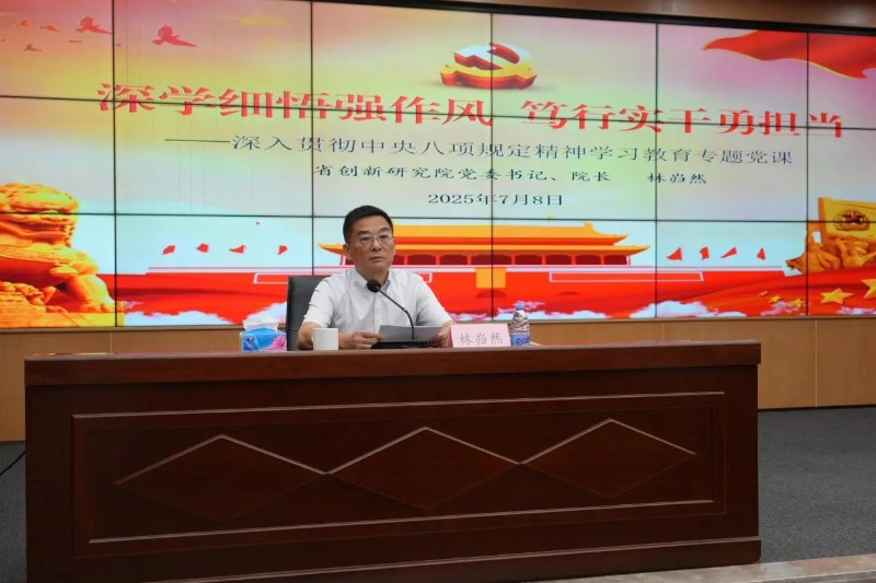 7月8日,省创新研究院举办深入贯彻中央八项规定精神学习教育专题党课,院党委书记、院长林岿然同志以“深学细悟强作风 笃行实干勇担当”为主题,为全院党员、干部讲授专题党课,在家院领导,院机关及所属单位全体党员、干部80余人参加。