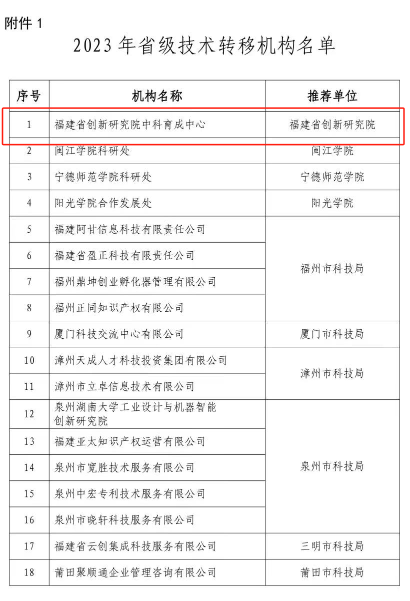 12月13日,福建省科学技术厅公布2023年福建省级技术转移机构名单,福建省创新研究院中科育成中心位列榜首成功入选。