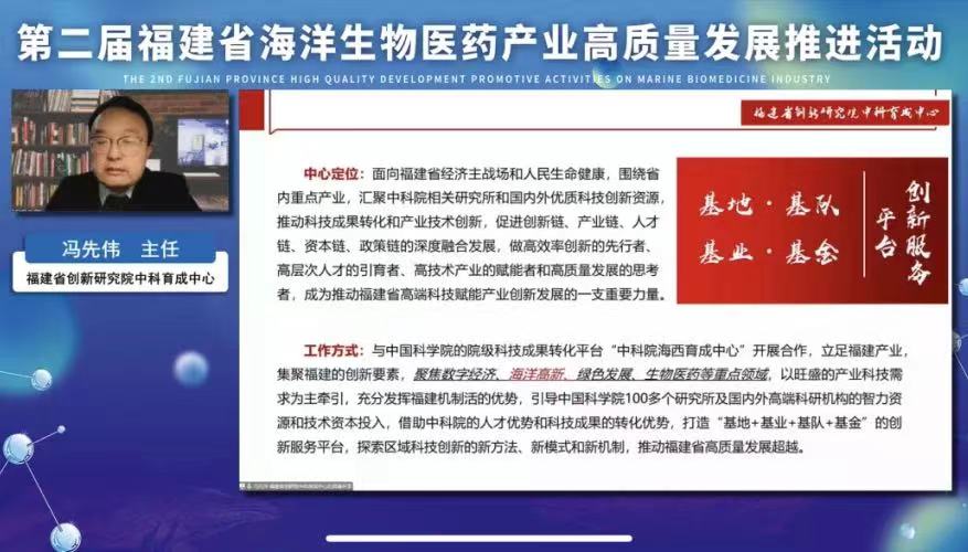 12月23日,中科育成中心主任冯先伟应邀以线上视频会的形式,在第二届福建省海洋生物医药产业高质量发展推进活动上做成果推介。