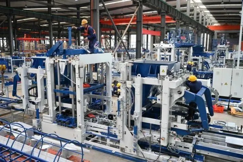 位于福建泉州的一家机械生产企业人员在加紧生产销往海外的全自动砌块成型机。(2022年12月14日摄)