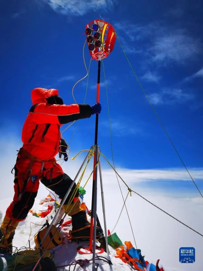 成功登顶的珠峰高程测量登山队队员,与珠峰大本营连线,实时传播高清视频画面。