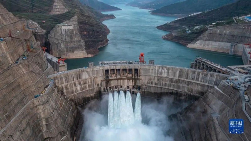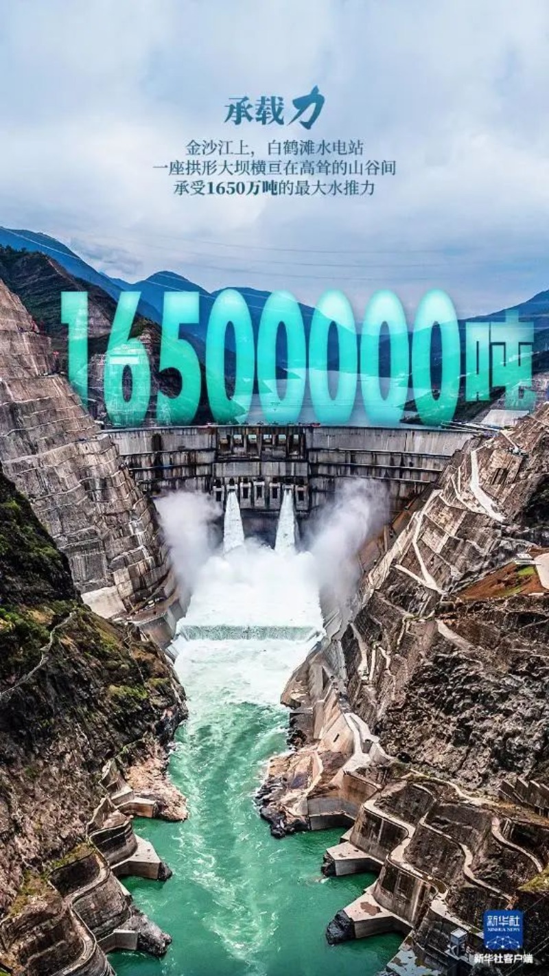 金沙江上,白鹤滩水电站,一座拱形大坝横亘在高耸的山谷间,承受1650万吨的最大水推力。