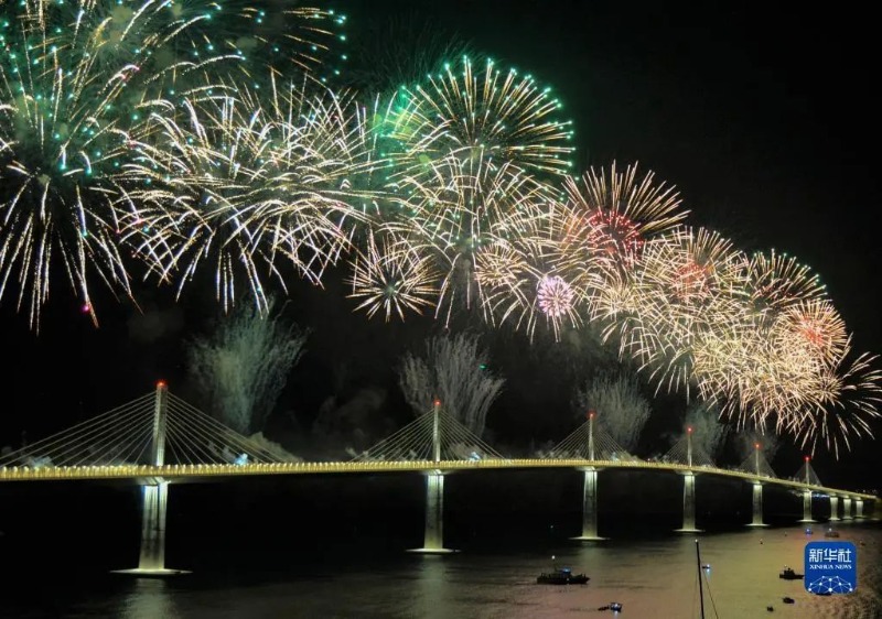 这是在克罗地亚科马尔纳拍摄的由中企承建的佩列沙茨大桥通车仪式上的焰火表演(2022年7月26日摄)。新华社记者李学军摄